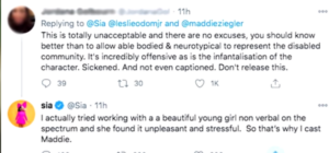 Et andet problem med filmen er, at Maddie ikke engang er autistisk, så hun burde ikke have rollen. Sia har nævnt hun originalt, havde en ung autistisk skuespiller. Hele setuppet var for overvældende for den autistiske skuespiller. Så i stedet for at gøre miljøet bedre for denne autisme skuespiller bliv hun fyret og erstattet med Maddie.