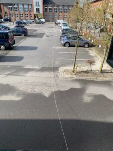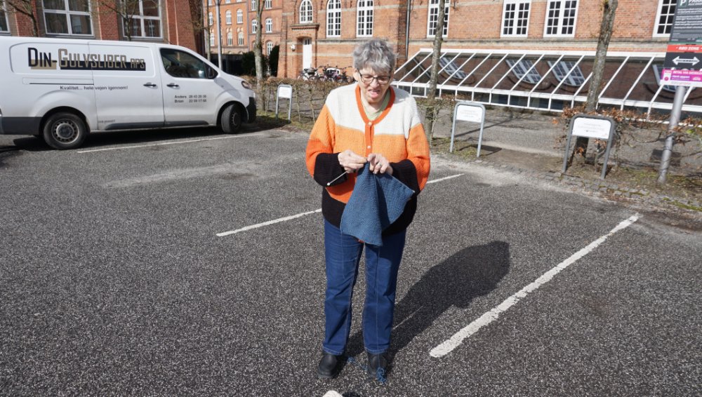Siden den 13/8-2021 og frem til nu har hun strikket 45,88 meter, hvilket svarer til en halv fodboldbane. På billederne er Anni og Ninna ved at måle op, hvor langt 45,88 er på Rytterkasernens parkeringsplads.