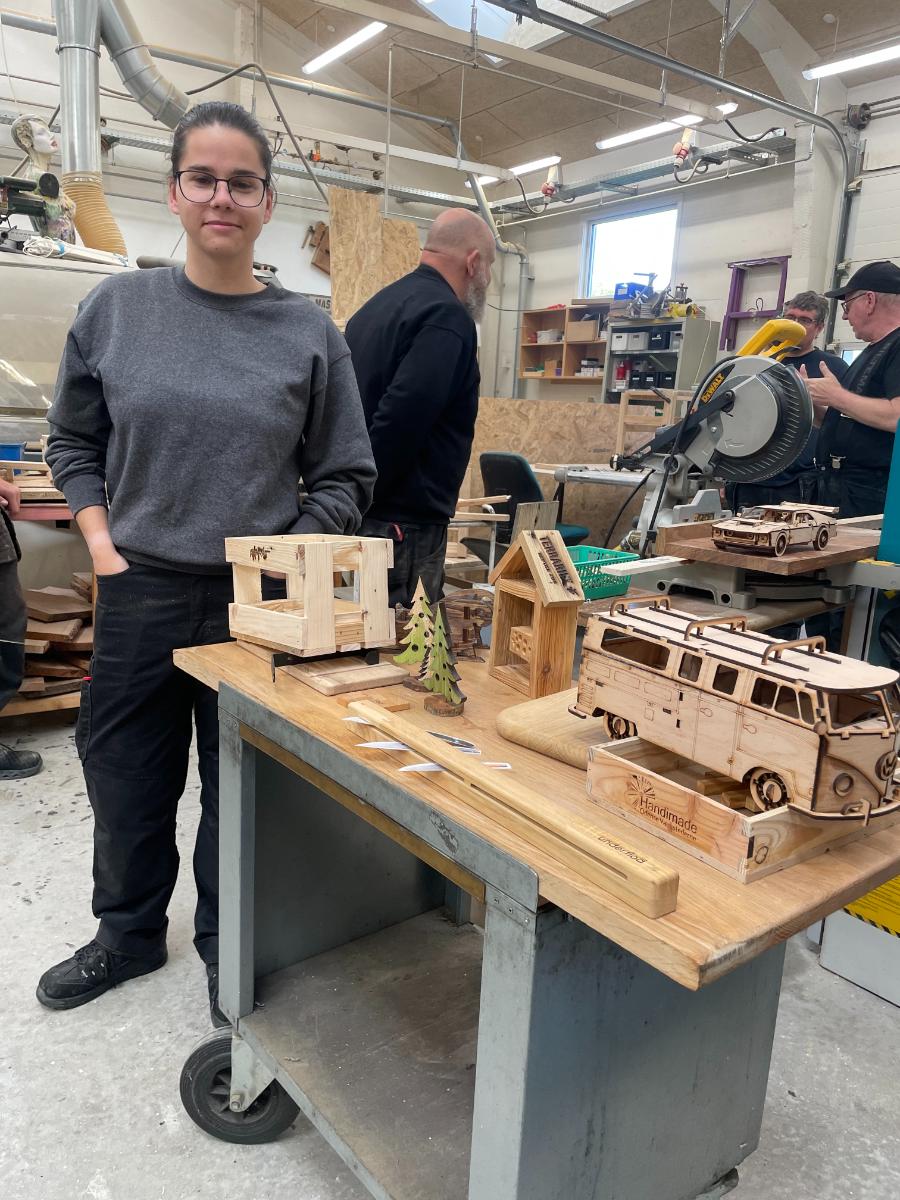 På billedet viser Julia nogle af de ting, hun har lavet, siden hun kom på træværkstedet.
