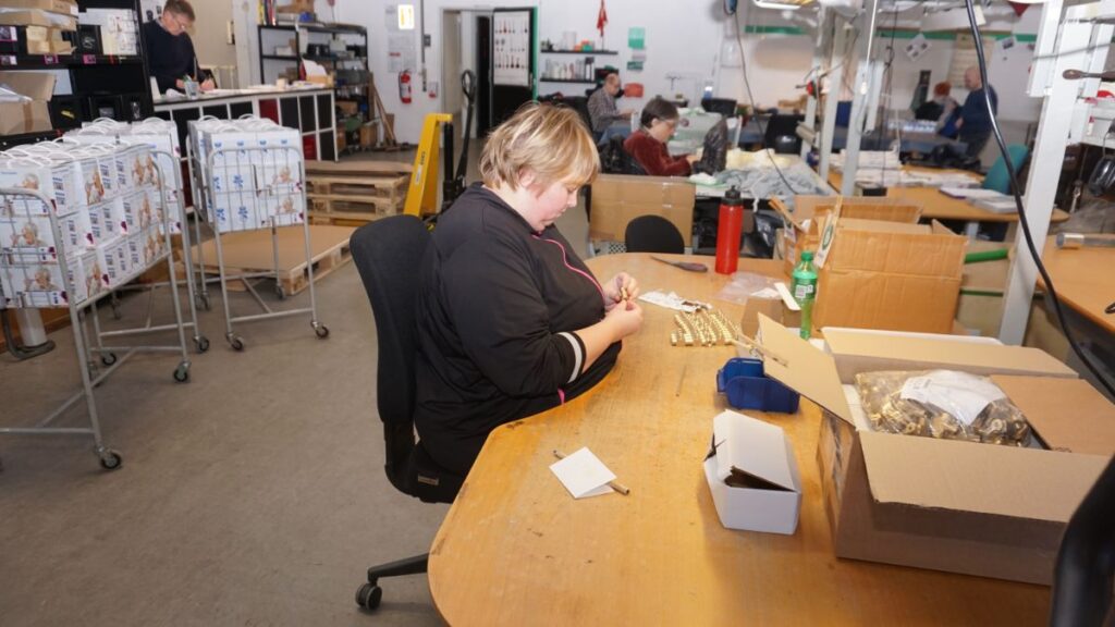 Linda fortæller: I Montagen er der rigtig mange pakkeopgaver til forskellige kunder. Vi har lige fået en ordre, hvor der skal en vimpel og to skruer i en plasticpose, som man så svejselukker. Derefter kommer man stregkode på posen. Før vi får vimplerne ind i Montagen, har Maskinværkstedet lavet et hul i hver vimpel.
