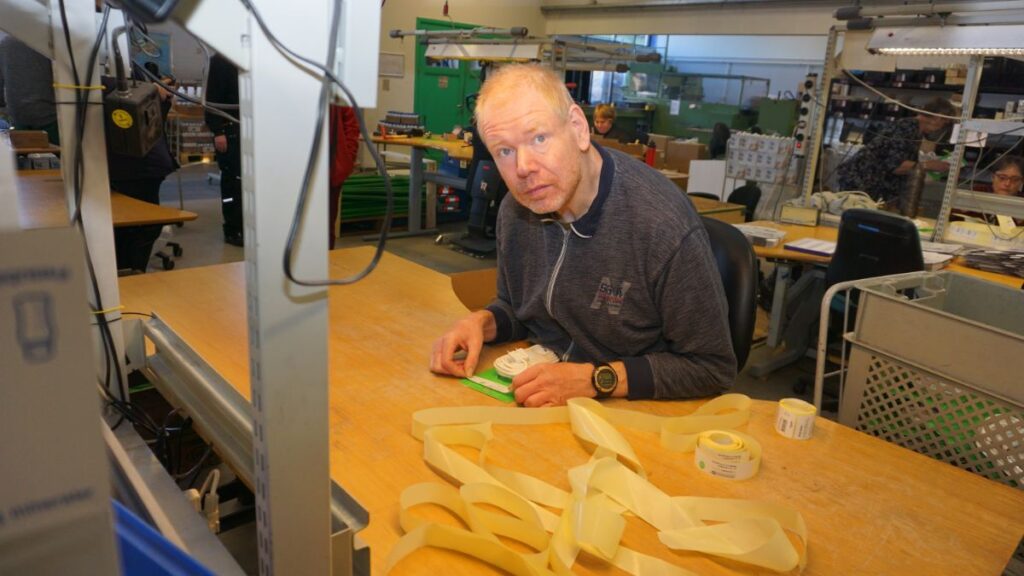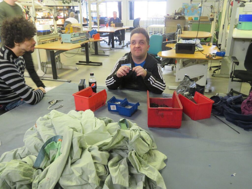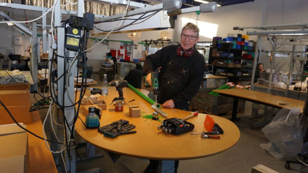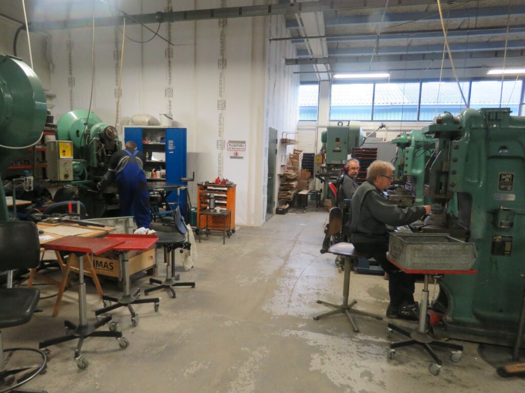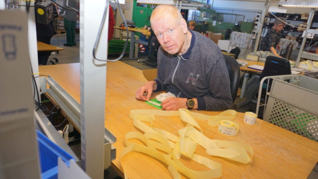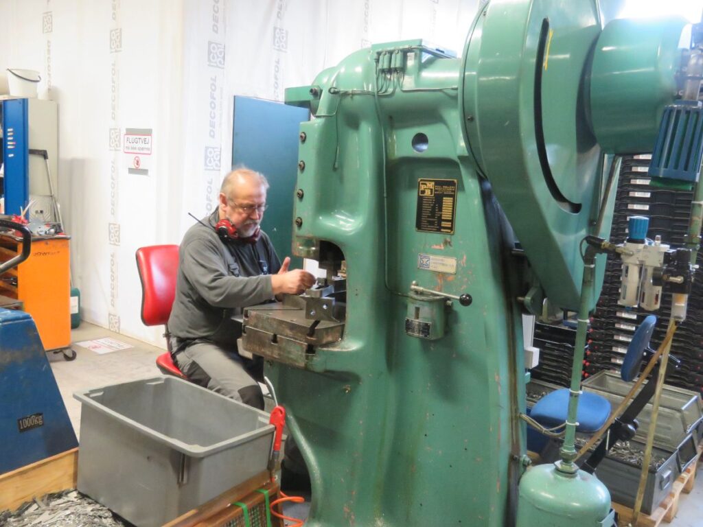Lige nu sprætter jeg kitler op, som skal laves til poser til Odense Kommune. Jeg laver lygte-beslag til Hella. Bjarne har tidligere lavet mange kabeldæksler. De bliver nu lavet i Indien.