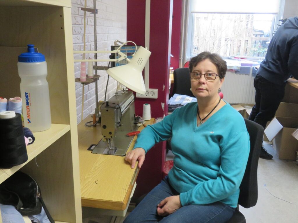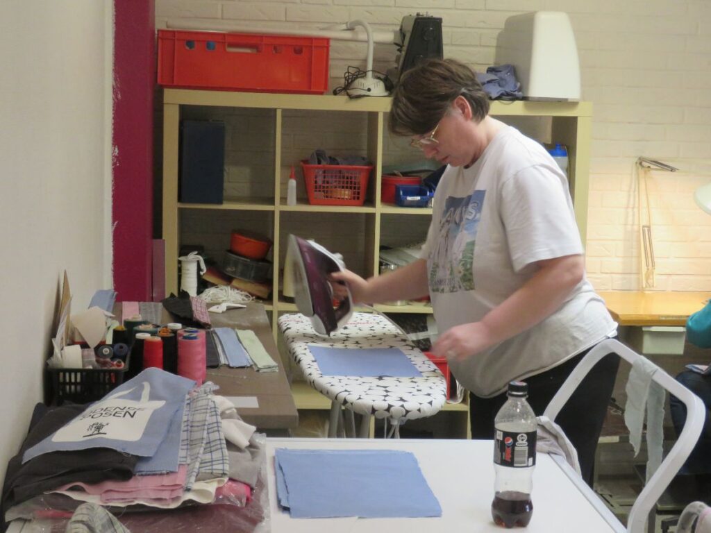 Pia er med til, at lave rigtig mange forskellige opgaver i Montagen. Lige nu er Pia på systuen, hvor hun laver poser til Odense Kommune. Poserne bliver lavet af gamle kitler fra hjem-meplejen, som på den måde genbruges.