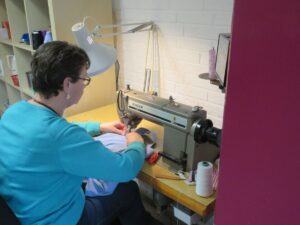 Vi havde det gamle undervisningslokale, hvor vi kunne indrette en lille systue. Senere har Odense Kommune bestilt 1000 poser. De skal bruges til Eventyrløbet. Når man tilmelder sig, får man et løbenummer, et armbånd og en t-shirt. I stedet for at få det udleveret i en plasticpose, så får man det i en genbrugspose, som vi på Systuen har lavet af Social og sundheds personalernes gamle kitler. De skulle alligevel være bleven smidt på forbrændingen.