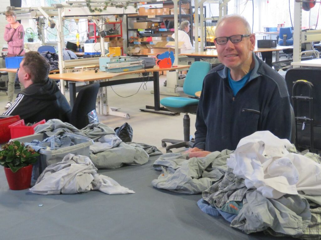 Lige nu arbejder jeg på systuen, hvor jeg syr poser til Odense Kommune. Ellers pakker jeg proteindrik til dem, der er småt spisende.