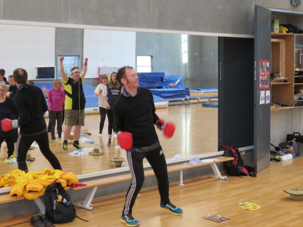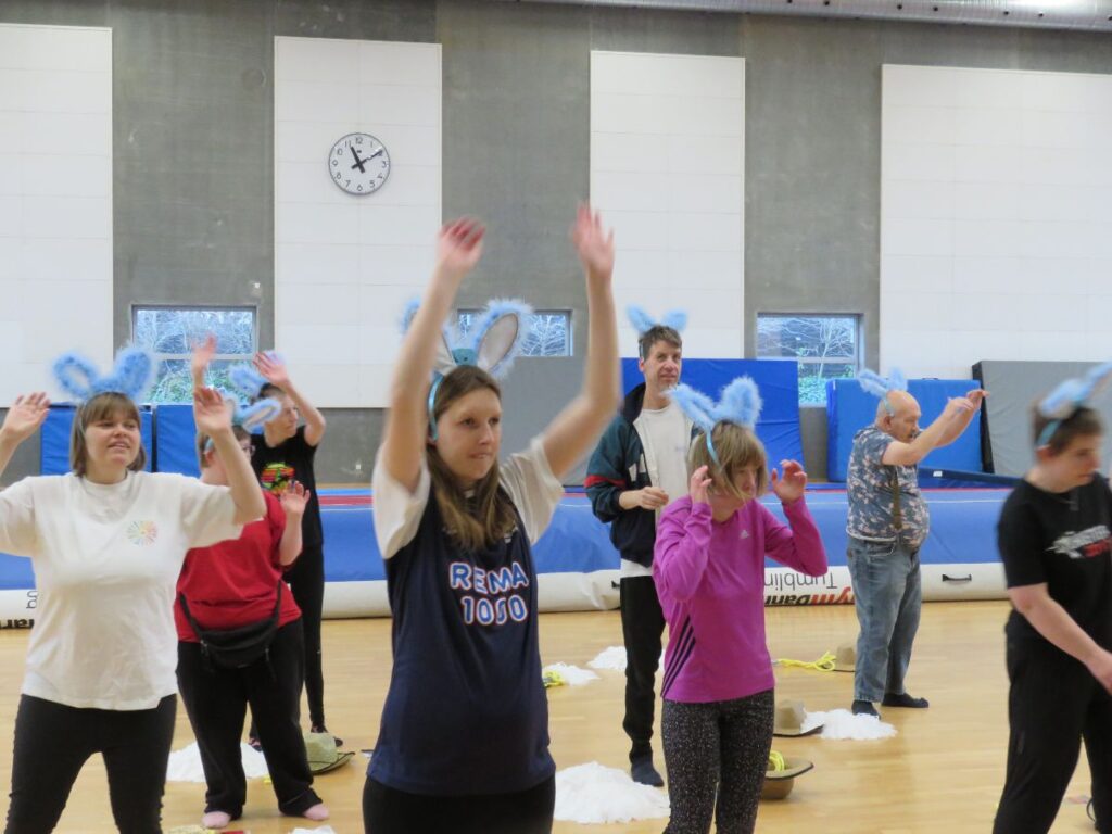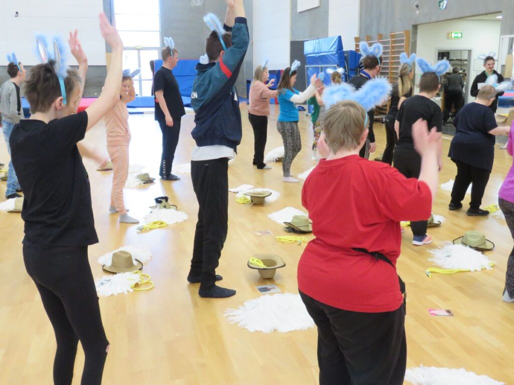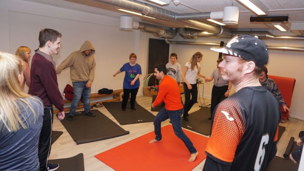 Til opvarmningen har medarbejderen valgt musikken. Nogen gange er det en sangleg, eller en anden sjov leg som er opvarmningen. Efter opvarmningen er der medarbejder-ne, der på skift viser hvilke øvelser, der skal laves.