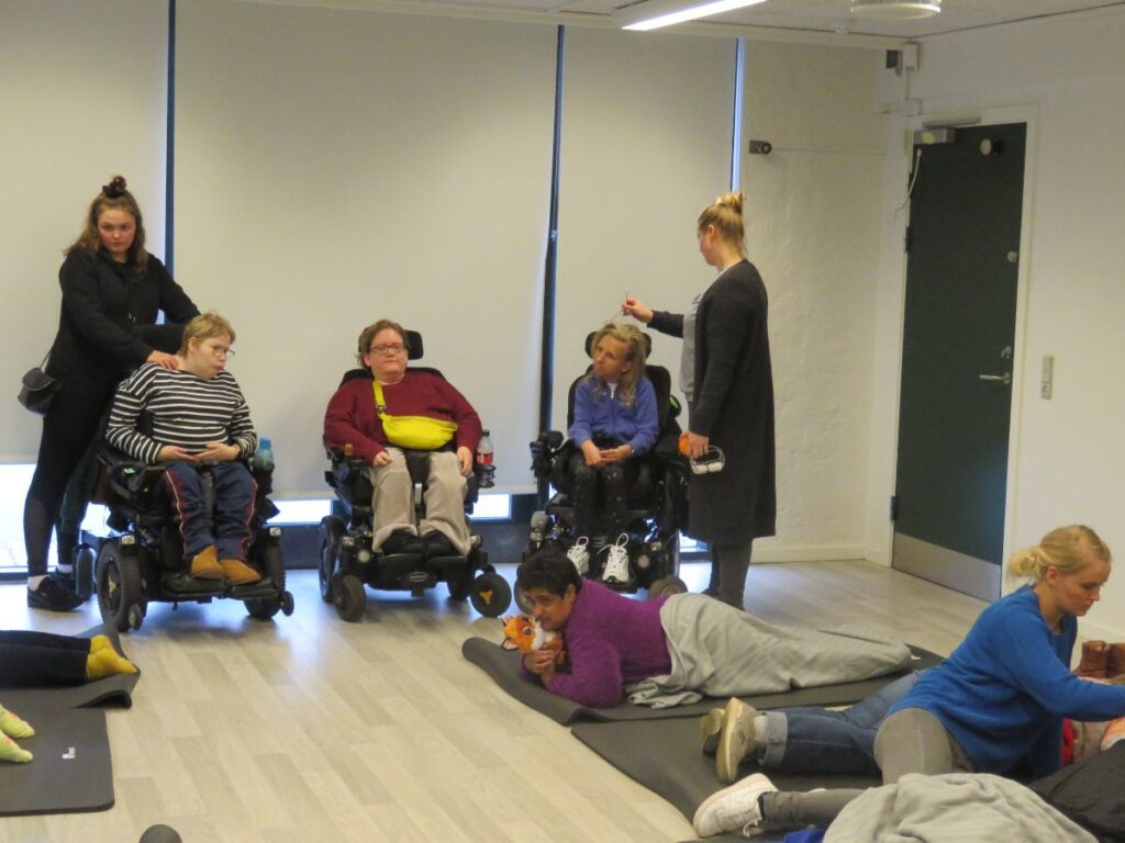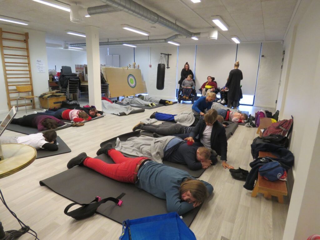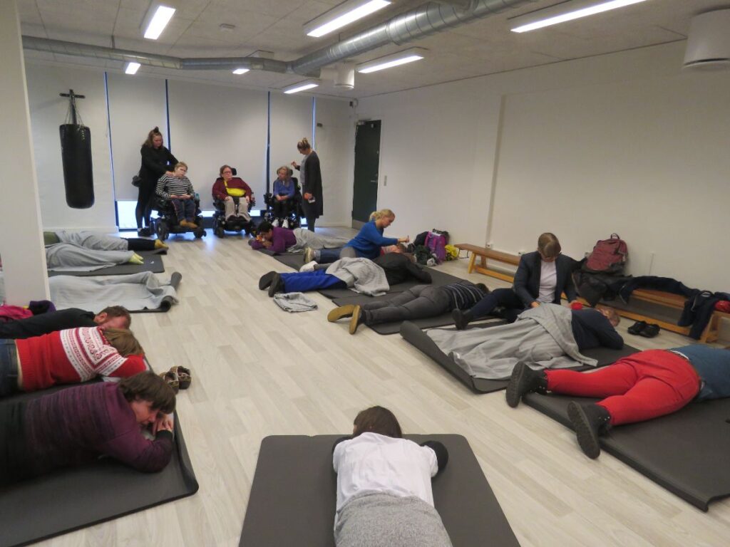 Først bliver der lagt madrasser på gulvet, til dem der ikke sider i kørestol og
