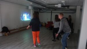 Man ser på figurerne på storskærmen, og laver de samme bevægelser, som på skær-men og så danser man til musikken.