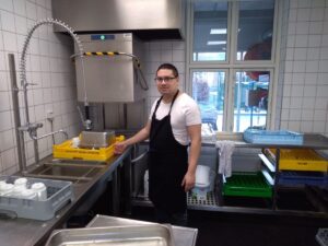 Om morgenen når jeg møder, er jeg i opvasken. Jeg er med til at lave varm mad, og jeg laver smørrebrød. Jeg er også med til at gøre rent.
