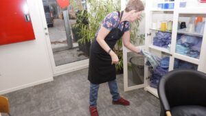 Jeg vasker op og lægger vasketøj sammen og lægger det på plads. Jeg kan rigtig godt lide at være i Køkkenet på Rytterkasernen